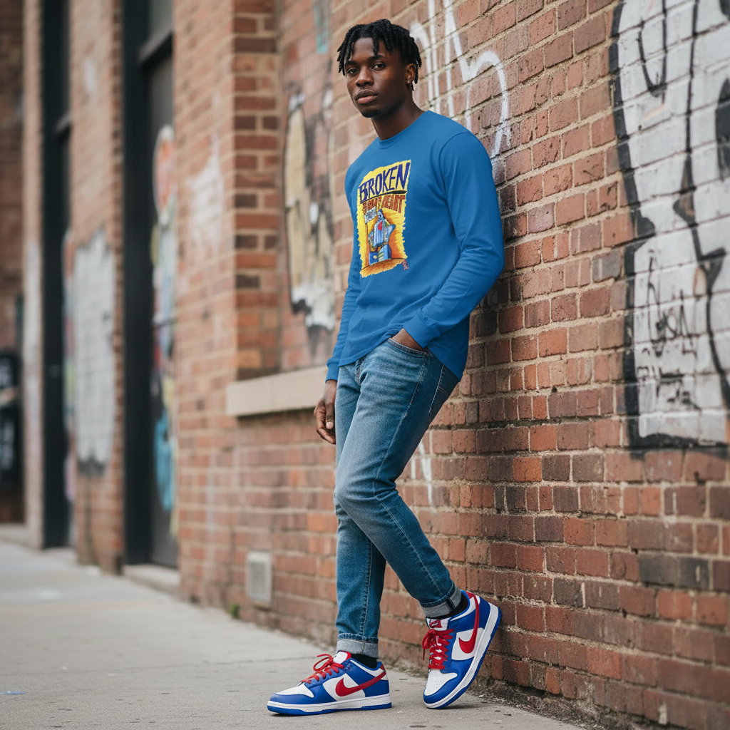 The Broken Robot Heart Long-Sleeve T-Shirt mixes retro robot style with raw emotion. Bold lines, bright colors, and a cracked heart that says everything without saying a word. Hand-drawn, expressive, and pure Think Tank energy.